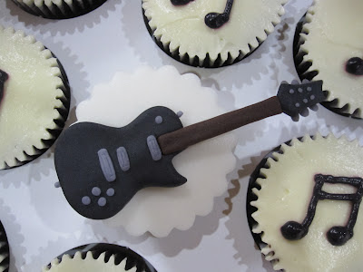 This client wanted a guitars and music notes on cupcakes. But because of her budget we could only make her one 3-D guitar. Of course Jack made the guitar and I piped the notes. Awesome mini guitar, don't you think?